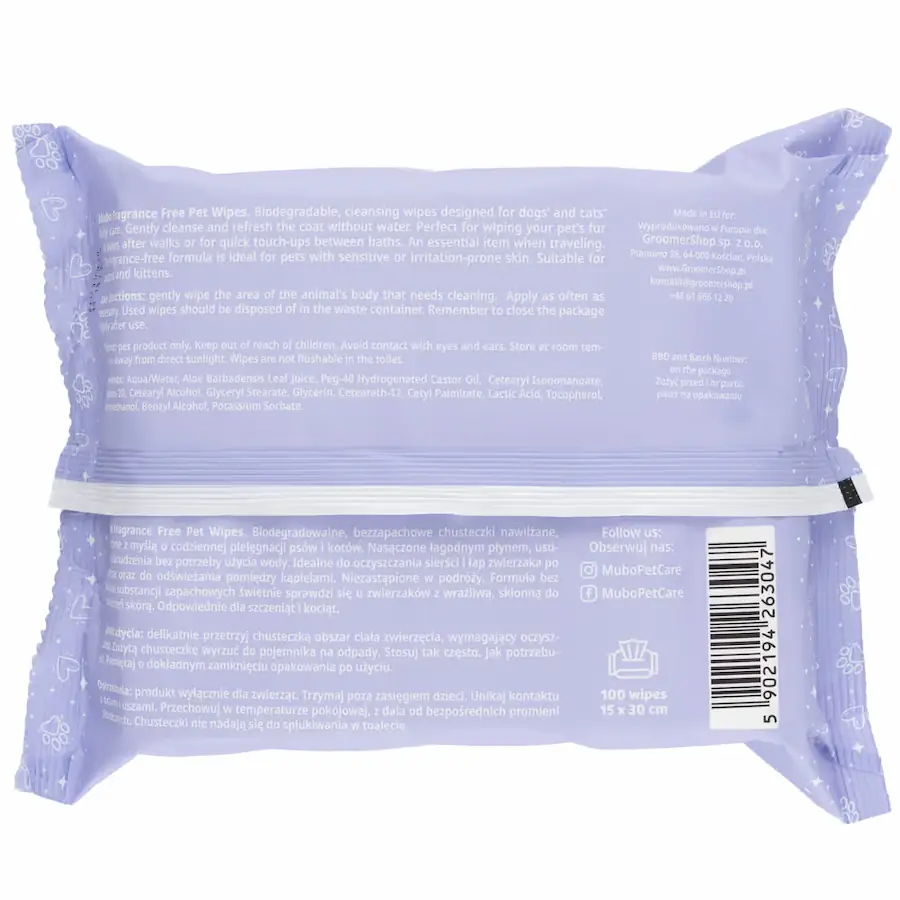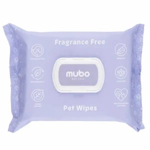 Mubo Fragrance Free Pet Wipes 100 szt. to bezzapachowe chusteczki dla psa i kota z dodatkiem aloesu, stworzone do codziennej pielęgnacji bez użycia wody. Delikatnie oczyszczają skórę i sierść, jednocześnie nawilżając i wspierając regenerację – idealne dla zwierząt o wrażliwej skórze.
