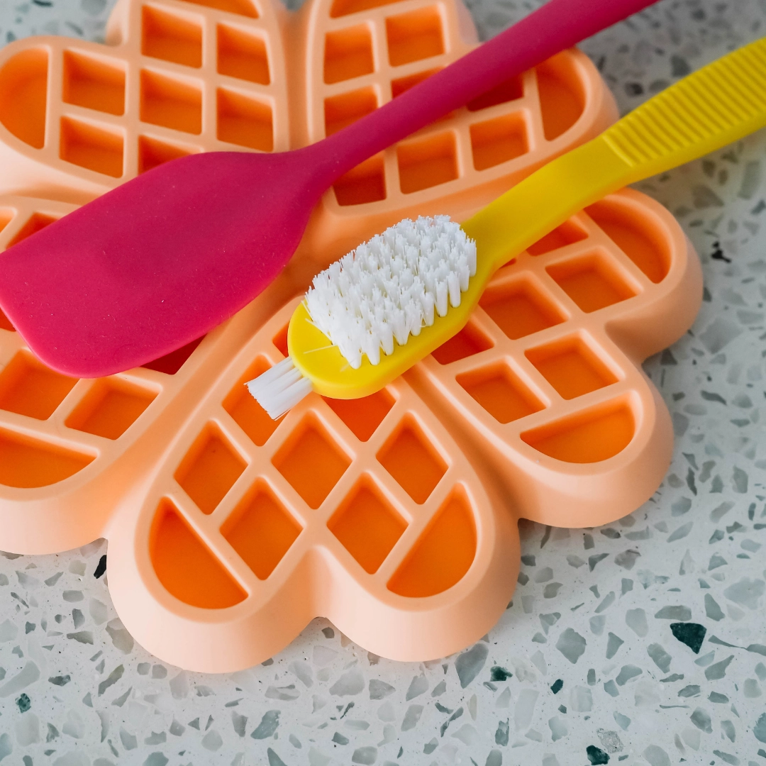 Szczoteczka posiada elastyczne, a jednocześnie trwałe włosie, które skutecznie czyści bez ryzyka uszkodzenia silikonowej powierzchni. Dodatkowa mini-szczoteczka na czubku ułatwia dotarcie do trudno dostępnych miejsc, takich jak narożniki czy drobne detale wzoru.