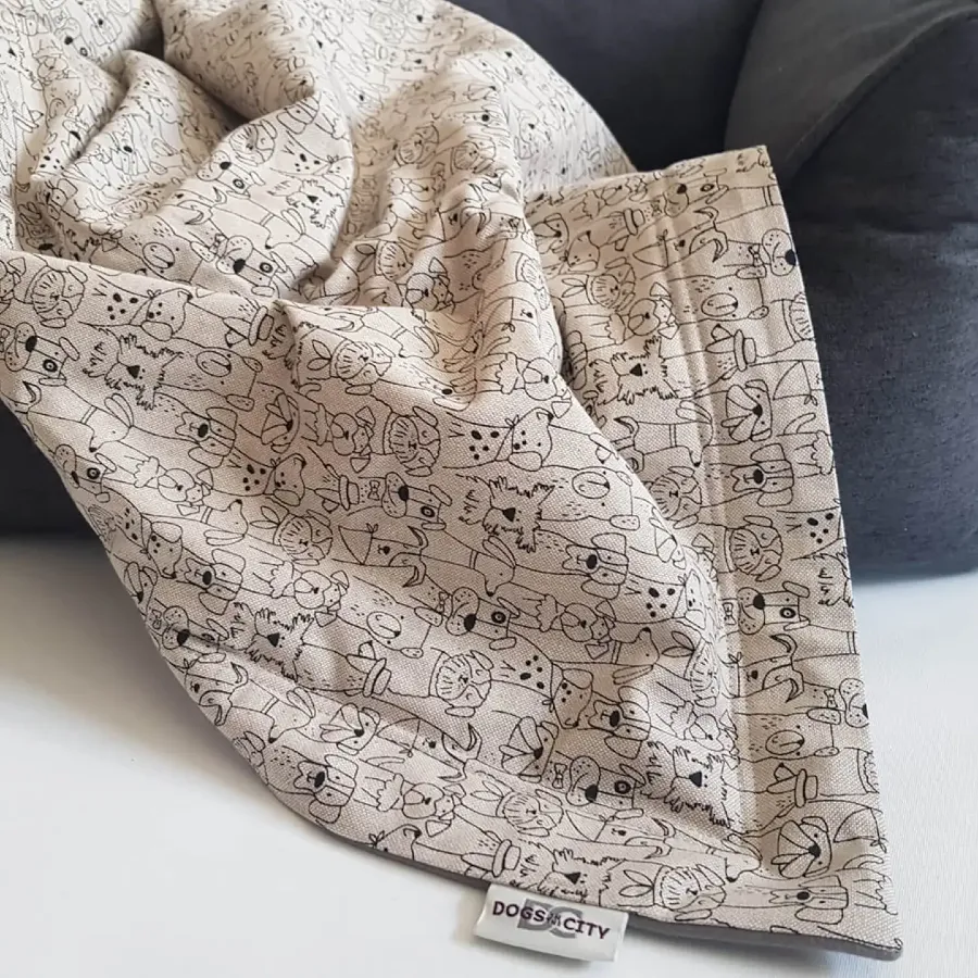 Kocyk jest dwustronny i pikowany – z jednej strony ma gładki, miękki materiał w kolorze grafitowym, z drugiej ozdobiony jest subtelnym motywem psów. Wnętrze wyściełane grubym, ciepłym polarem zapewnia komfort termiczny i miękkie podłoże do leżenia.