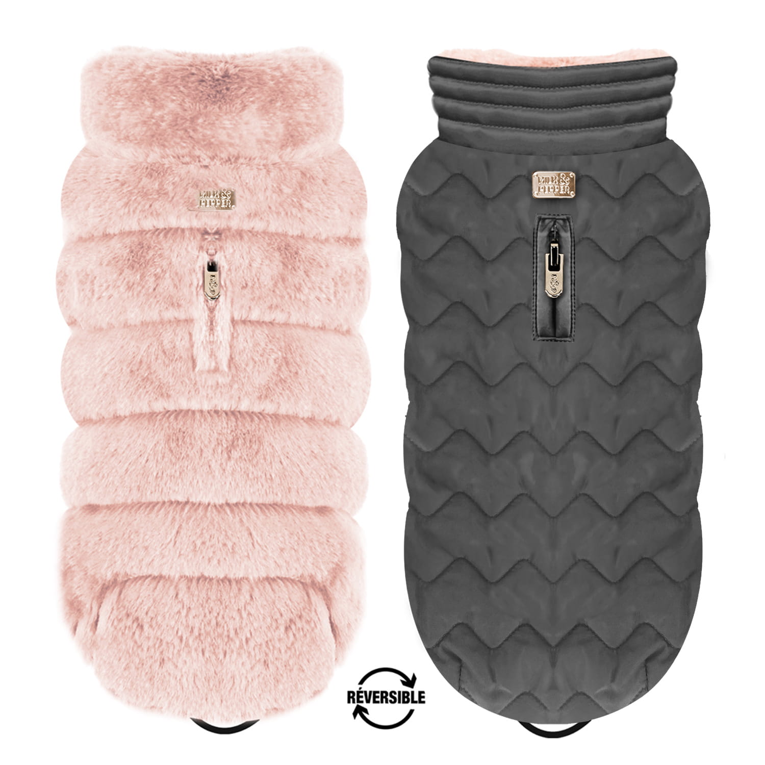 Milk & Pepper Louise Reversible Puff Jacket to dwustronna, ciepła kurtka dla małych i średnich psów – elegancka, funkcjonalna i pełna detali. Z jednej strony miękkie, pudroworóżowe futerko, a z drugiej pikowany, wodoodporny materiał w odcieniu antracytowej szarości.
