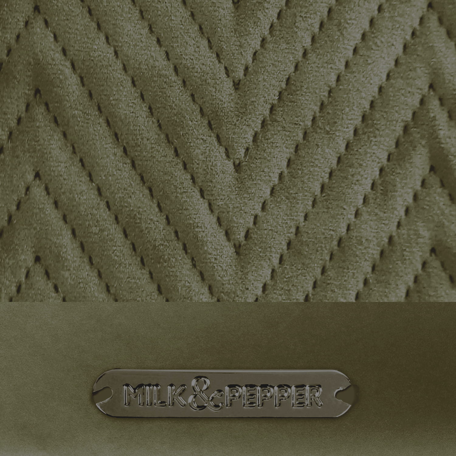 Subtelna metalowa plakietka z logo Milk & Pepper w kolorze tytanu lub złota podkreśla luksusowy charakter produktu.