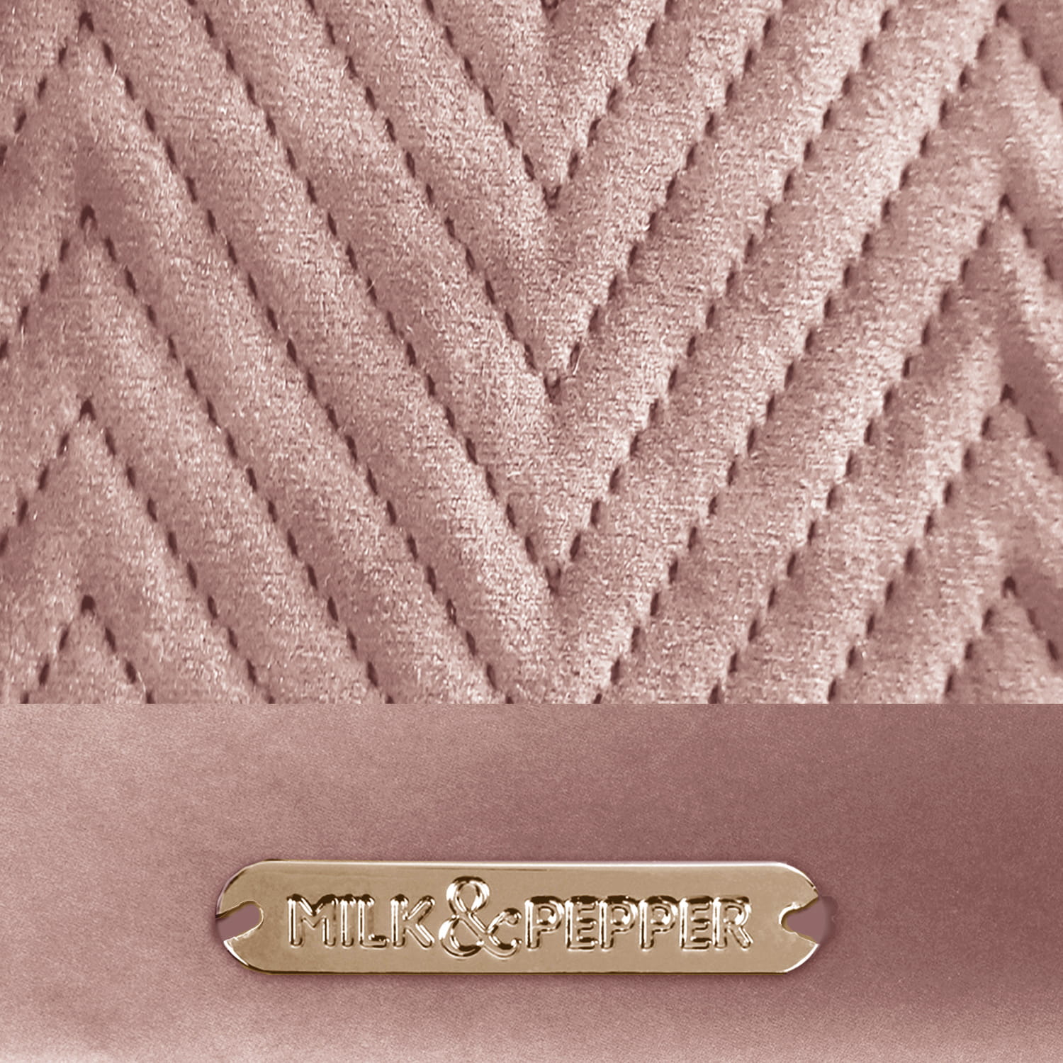 Subtelna metalowa plakietka z logo Milk & Pepper w kolorze tytanu lub złota podkreśla luksusowy charakter produktu.
