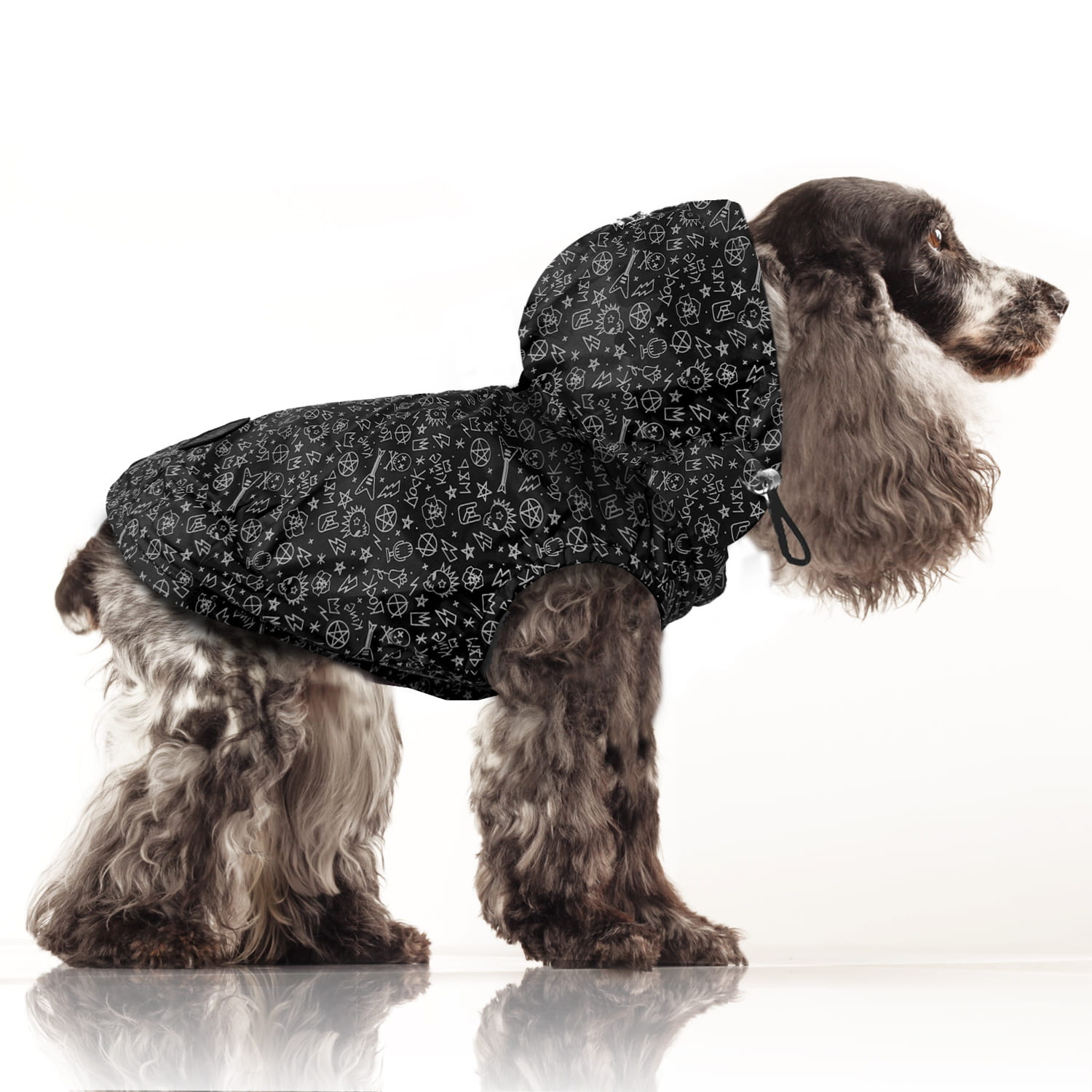 Milk & Pepper Zack Black Raincoat to model dla psów, które dobrze czują się w minimalistycznych, wyrazistych fasonach. Czarny, wodoodporny materiał z delikatnym motywem rock&roll zapewnia ochronę przed deszczem, dodając ubranku charakteru i miejskiego wyrazu.