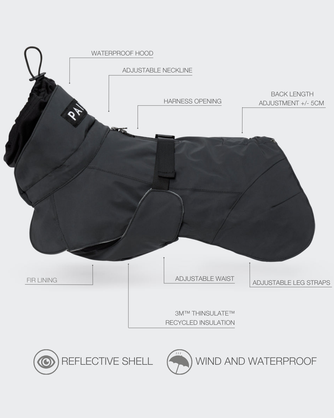 PAIKKA Visibility Winter Jacket Dark to minimalistyczna, wodoodporna kurtka zimowa dla psa, wykonana z w pełni odblaskowej tkaniny. Łączy lekkie ocieplenie 3M™ Thinsulate™ z technologią Far Infrared, zapewniając ciepło, wygodę i pewną widoczność w każdych warunkach.