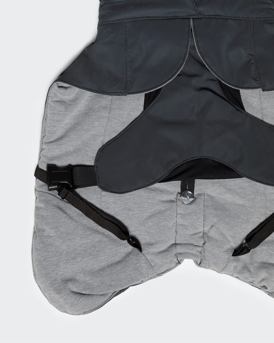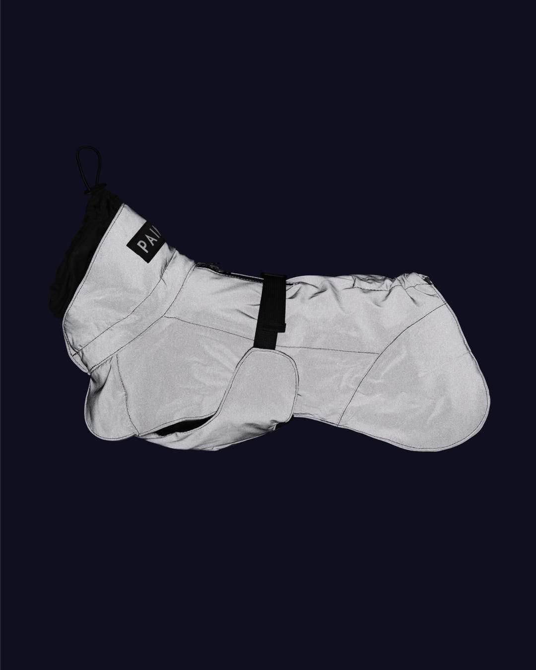 Materiał kurtki jest w pełni odblaskowy, zapewniając widoczność po zmroku oraz w trakcie opadów. W dzień zachowuje subtelny, ciemny kolor, a nocą odbija światło, zwiększając bezpieczeństwo psa.