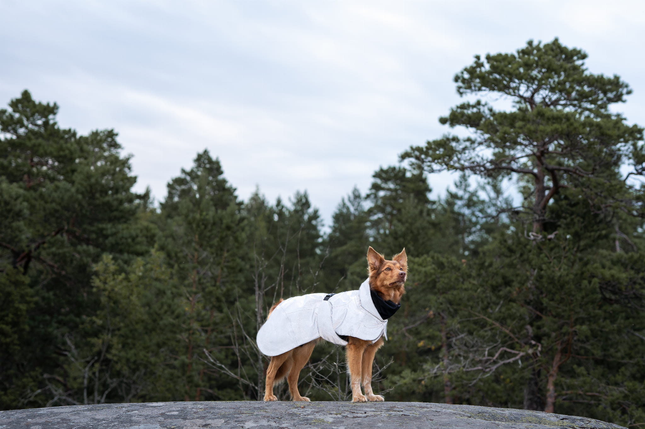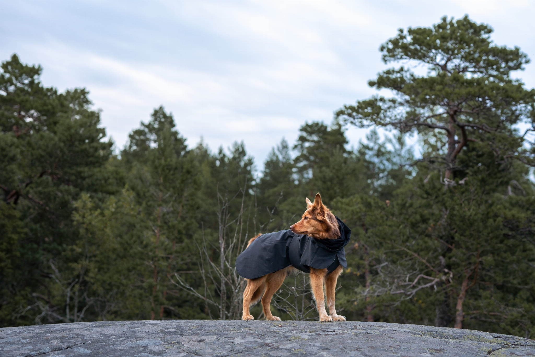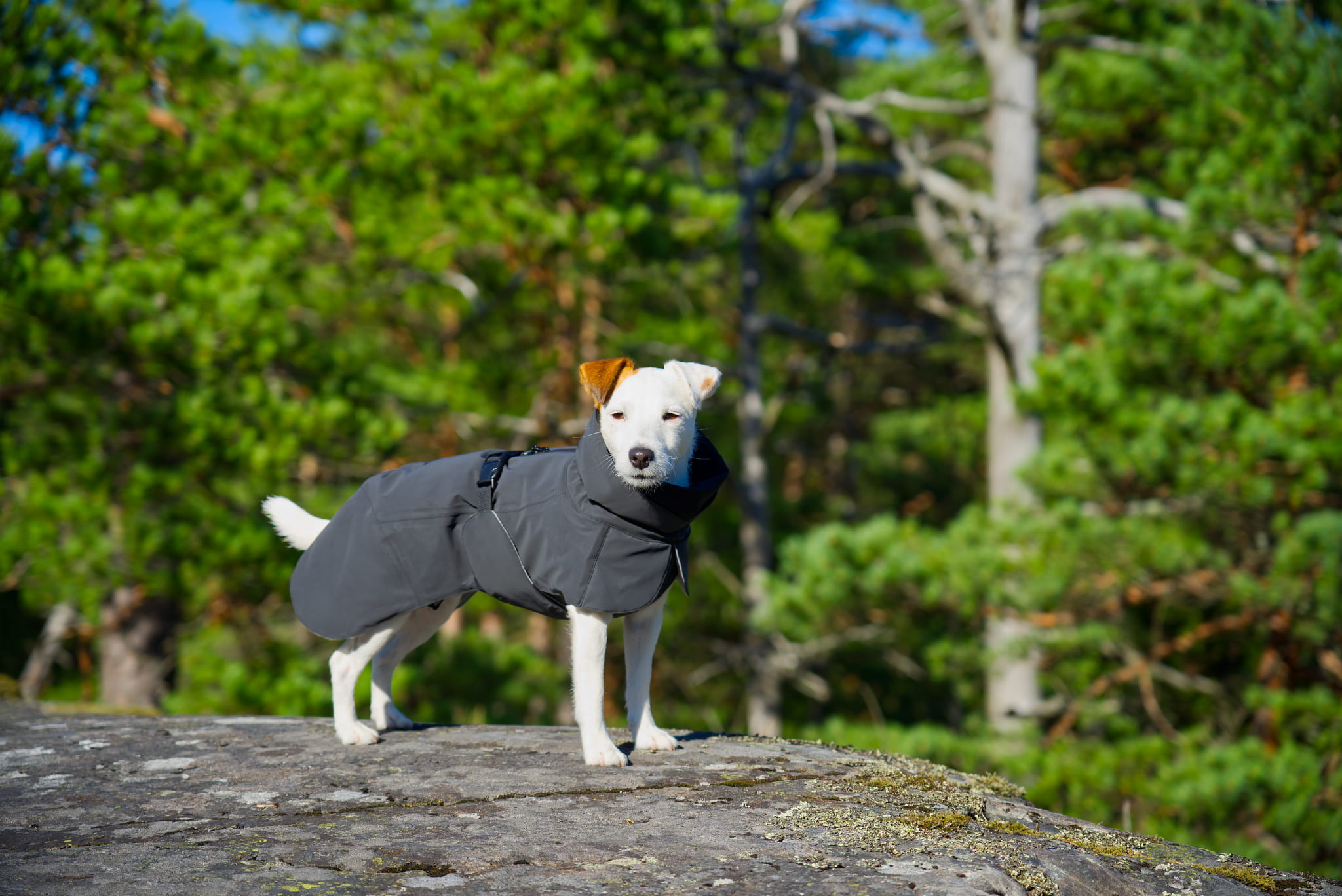 Kurtka zapewnia wodoodporność na poziomie 10 000 mm, a podklejone szwy chronią przed wnikaniem wody. Zintegrowany kaptur i dopracowany krój osłaniają klatkę piersiową, szyję i grzbiet, chroniąc psa przed wiatrem i opadami.