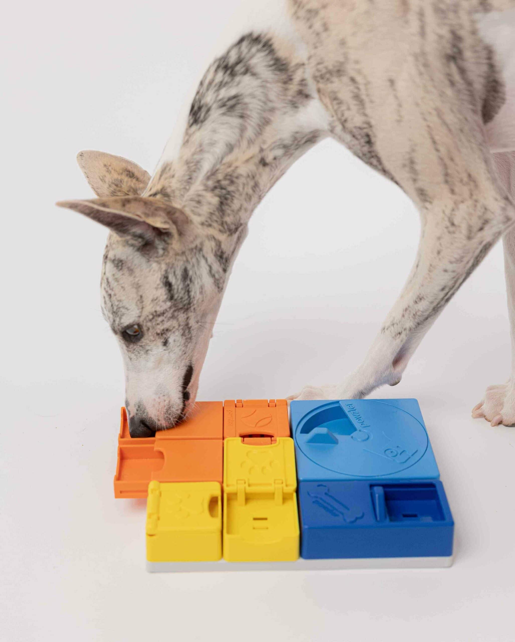 Każdy z kolorowych elementów kryje inny mechanizm: przesuwanie, unoszenie, przekręcanie. Wystarczy wypełnić je ulubionymi smakołykami lub suchą karmą, a Twój pies zacznie tropić, przesuwać i odkrywać ukryte nagrody.
