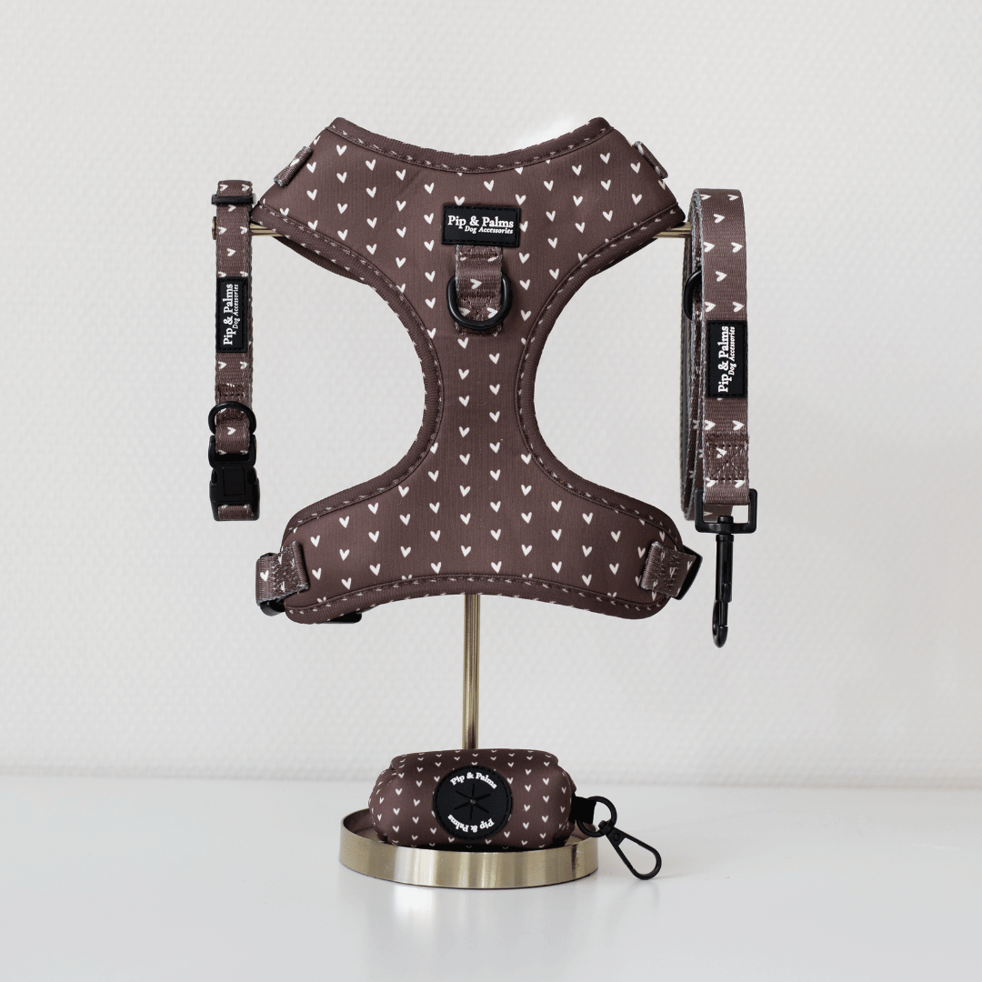 Szelki Pip & Palms Dog Harness Choco Loco Love powstały z inspiracji codziennością z psem — pełną ruchu, wspólnych chwil i bliskości. Stonowana paleta brązów z delikatnym wzorem w serca tworzy harmonijny, naturalny look.